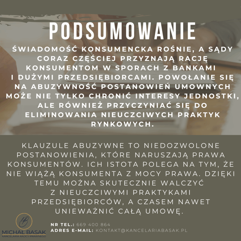 Świadomość konsumencka rośnie, a sądy coraz częściej przyznają rację konsumentom w sporach z bankami i dużymi przedsiębiorcami. Powołanie się na abuzywność postanowień umownych może nie tylko chronić interesy jednostki, ale również przyczyniać się do eliminowania nieuczciwych praktyk rynkowych.