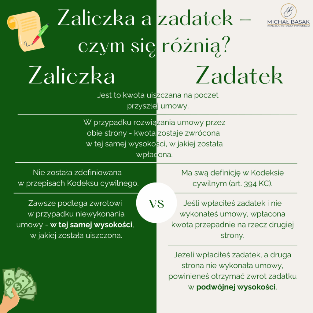 Choć potocznie zaliczka i zadatek bywają utożsamiane, w rzeczywistości wywołują odmienne skutki prawne. Zadatek pełni funkcję zabezpieczająco-dyscyplinującą, a zaliczka jest rozwiązaniem neutralnym.