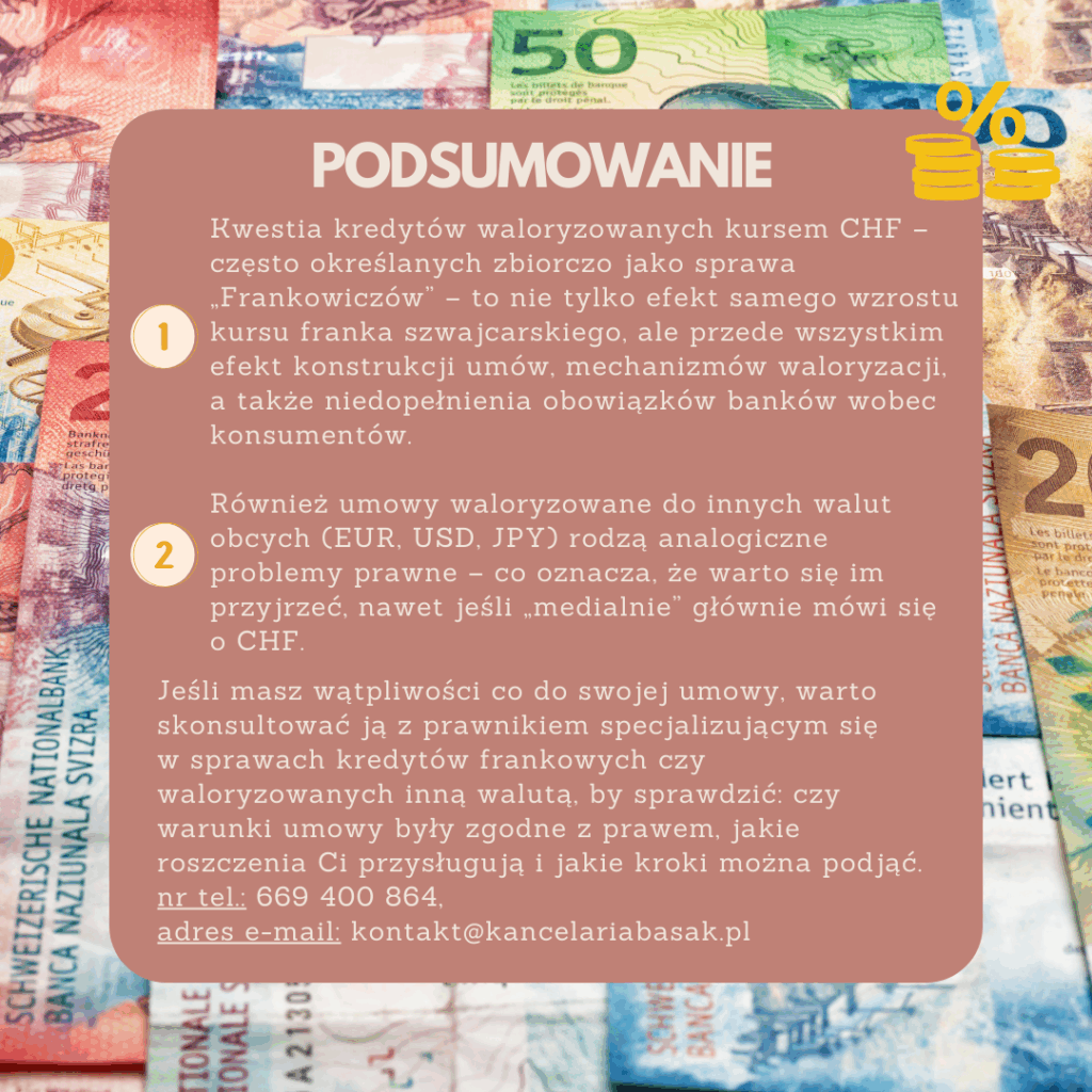 Kwestia kredytów waloryzowanych kursem CHF – często określanych zbiorczo jako sprawa „Frankowiczów” – to nie tylko efekt wzrostu kursu franka szwajcarskiego, ale przede wszystkim efekt konstrukcji umów, mechanizmów waloryzacji, a także niedopełnienia obowiązków banków wobec konsumentów. Orzecznictwo obecnie sprzyja konsumentom, ale sprawa wymaga zawsze indywidualnej analizy – zarówno treści umowy, jak i okoliczności jej zawarcia. Również umowy waloryzowane do innych walut obcych (EUR, USD, JPY) rodzą analogiczne problemy prawne – co oznacza, że warto się im przyjrzeć, nawet jeśli „medialnie” głównie mówi się o CHF.