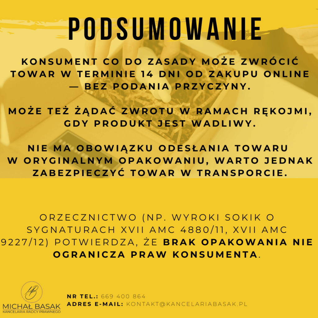 • Orzecznictwo (np. XVII AmC 4880/11, XVII AmC 9227/12) potwierdza, że brak opakowania nie ogranicza praw konsumenta.